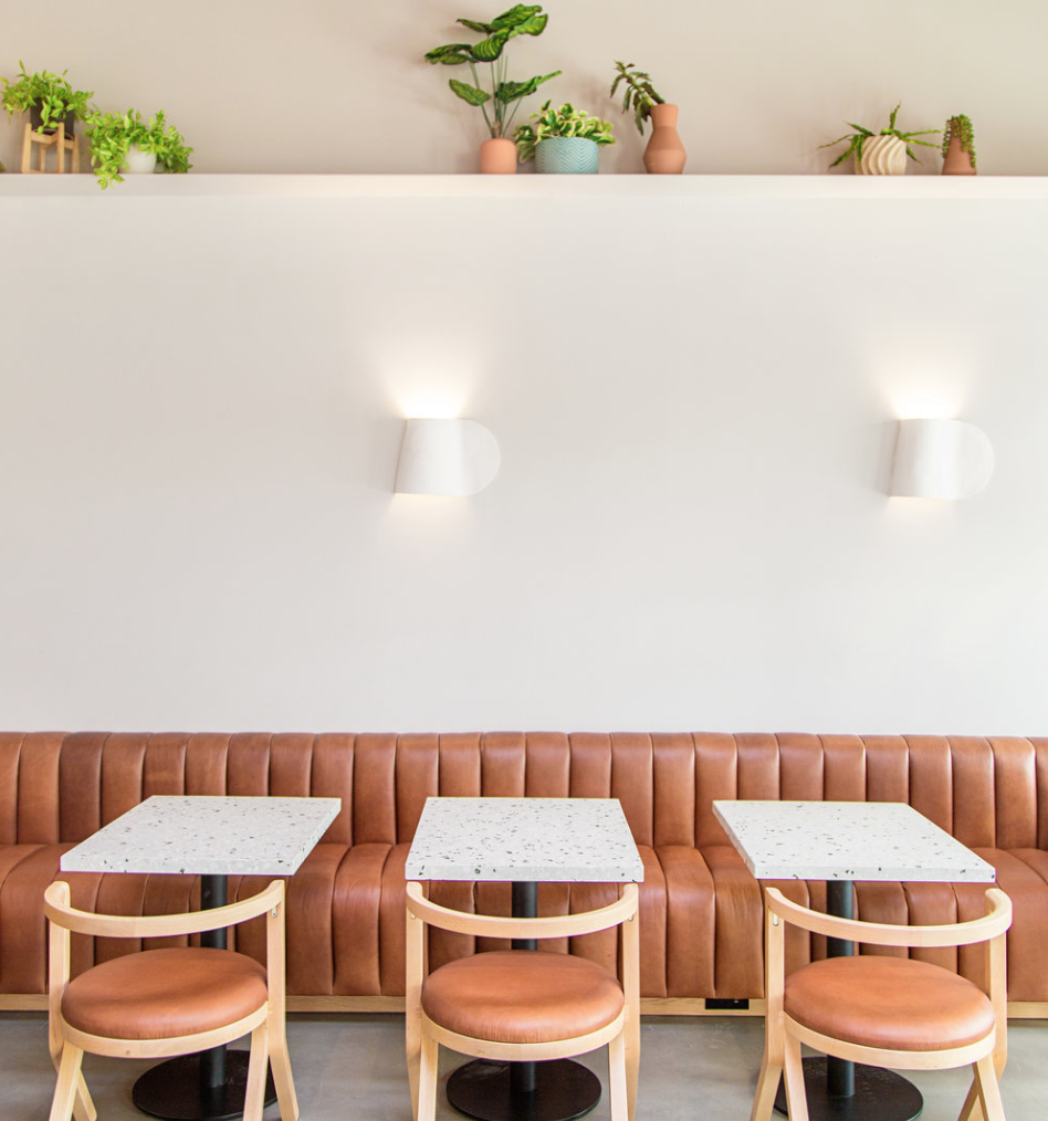 This spot, Highly Likely Cafe, in a totally unassuming location right in the middle of warehouse looking buildings, on a side street in between Mid City and Crenshaw, could be dubbed as a millennial designer's dream spot. Leather tufted banquets lining one wall, floating tables near the windows, a horseshoe shaped bar in the middle, and a tree, yes that's right, A TREE, to complete the mid century meets modern vibes.